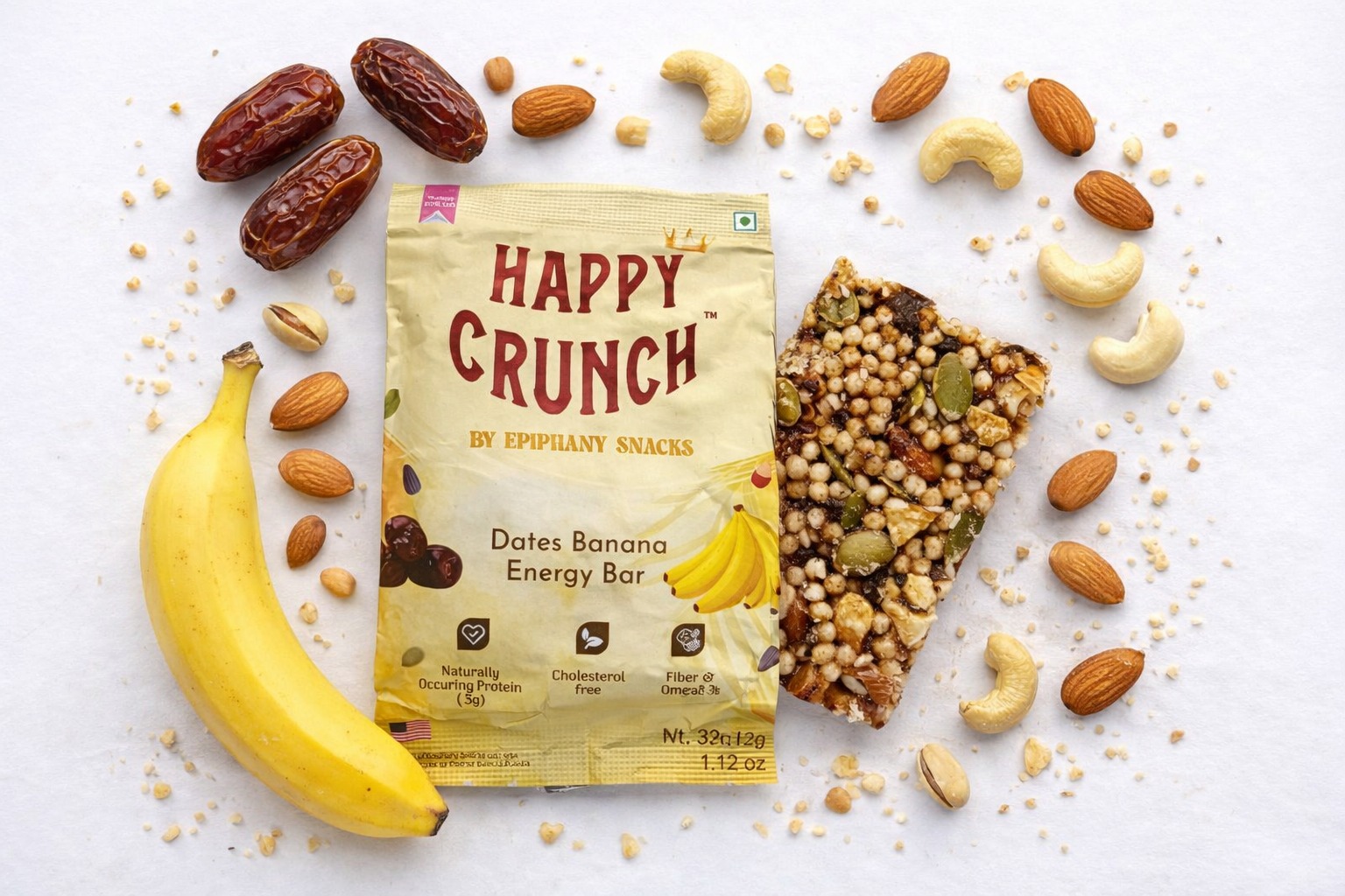 Savour the natural sweetness! Our Dates Banana Energy Bar combines dates, almonds, cashews, and pumpkin seeds with brown rice syrup and Himalayan Pink Salt for a nutritious energy boost.