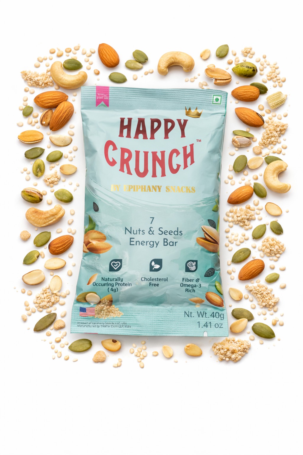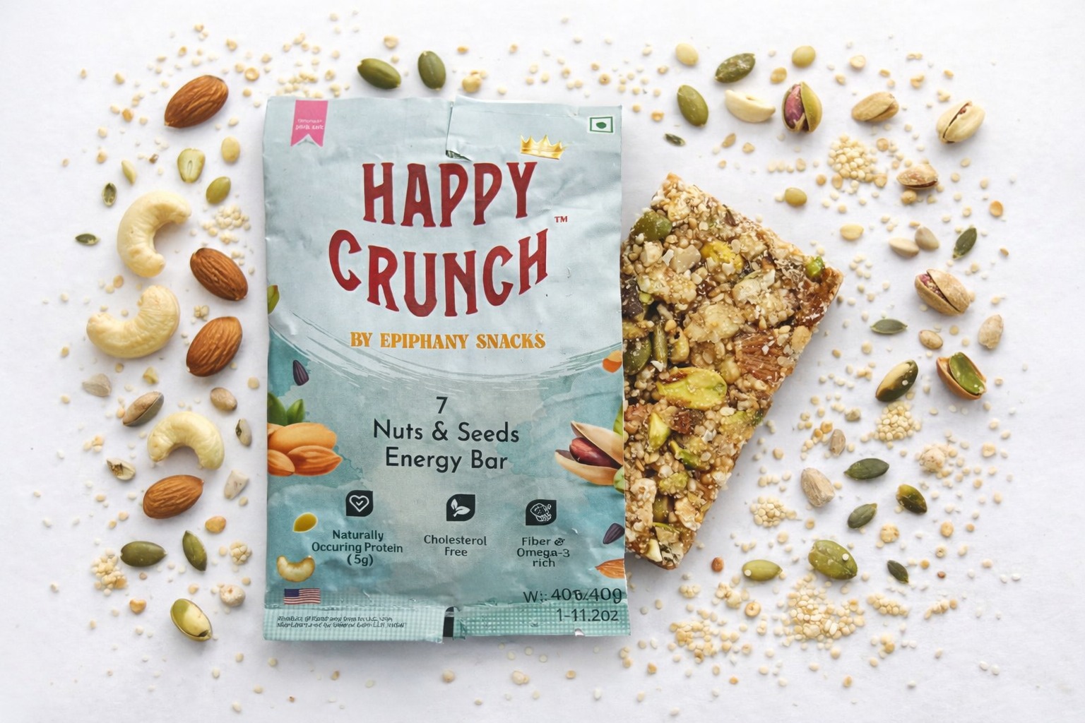 Unleash a powerhouse of nutrition! Our 7 Nuts and Seeds Energy Bar blends almonds, cashews, pumpkin seeds, pistachios, watermelon seeds, white sesame, and quinoa crisps with vanilla powder for a delicious energy boost.
